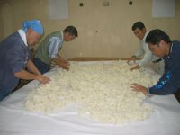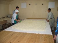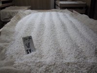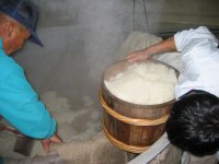 蒸し上がりが均等になるように均一に米をならす | ■ | 麹米が蒸しあがりました |