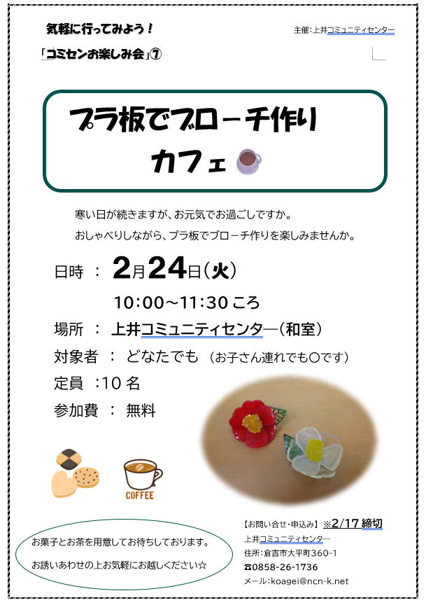 | 「コミセンお楽しみ会⑦「プラ板でブロ-チ作り カフェ」開催します! |